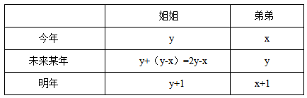【答案】D【解析】本題涉及到了兩個(gè)主體:姐姐和弟弟。涉及到了3個(gè)時(shí)間:即現(xiàn)在、未來某年和明年,所以可以通過列表的方式梳理題干中的條件。設(shè)今年弟弟為x歲,姐姐為y歲,可得: