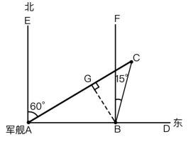 軍艦最終行駛至B點(diǎn),∠EAC=60°,∠CBF=15°,此題所求為軍艦行至B處時(shí)與燈塔C的距離,即為BC。
