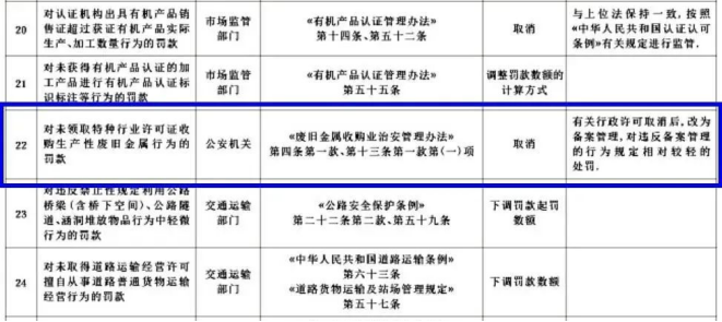 即:取消了“對(duì)未領(lǐng)取特種行業(yè)許可證收購生產(chǎn)性廢舊金屬的罰款”。該罰款設(shè)定依據(jù)為《廢舊金屬收購業(yè)治安管理辦法》第四條第一款、第十三條第一款第(一)項(xiàng)。罰款事項(xiàng)取消后的替代監(jiān)管措施:有關(guān)行政許可取消后,改為備案管理,對(duì)違反備案管理的行為規(guī)定相對(duì)較輕的處罰。