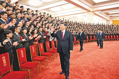 上午11時,習近平等來到人民大會堂北大廳,全場響起熱烈掌聲。習近平等走到代表們中間,同大家親切交流并合影留念。