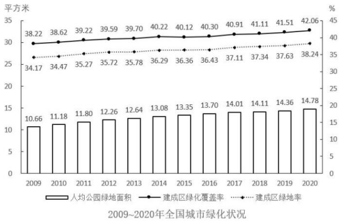 B.以2009年為基期計(jì)算,2009~2020年城市建成區(qū)綠地率年均上升0.4個(gè)百分點(diǎn)以上