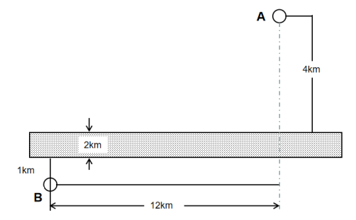 15.A、B兩個(gè)鄉(xiāng)鎮(zhèn)分布于山谷兩側(cè),山谷間有一條寬為2km的河道(如下圖所示)。當(dāng)?shù)卣疀Q定在兩個(gè)鄉(xiāng)鎮(zhèn)間修建一條跨河公路促進(jìn)旅游發(fā)展。由于架橋費(fèi)用高昂,所以要求跨河公路中的橋梁路段長度最短。那么根據(jù)圖中數(shù)據(jù),從A鎮(zhèn)前往B鎮(zhèn)的最短距離為:( )