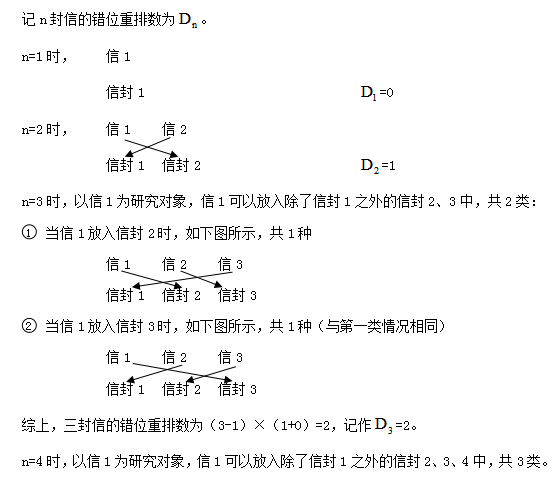 錯位重排問題是伯努利和歐拉在錯裝信封時發(fā)現(xiàn)的,因此又稱為伯努利-歐拉裝錯信封問題。錯位重排從字面意思理解,就是排錯了位置,所以它的基本特征就是每個元素不回到原本的位置。比如:編號是1、2、…、n的n封信,裝入編號為1、2、…、n的n個信封,要求每個信封裝一封信且每封信和信封的編號不同,問有多少種裝法?