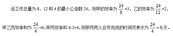 例1:一個工程項目,甲公司單獨做需要8天能完成,乙公司單獨做需要12天,甲、乙、丙三個公司4天能完成,則由甲、丙公司合作完成此項目共需多少天?( )