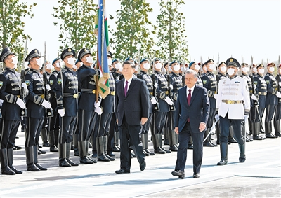 當?shù)貢r間9月15日,國家主席習近平在撒馬爾罕同烏茲別克斯坦總統(tǒng)米爾濟約耶夫會談。會談前,米爾濟約耶夫為習近平舉行隆重歡迎儀式。新華社記者申宏攝