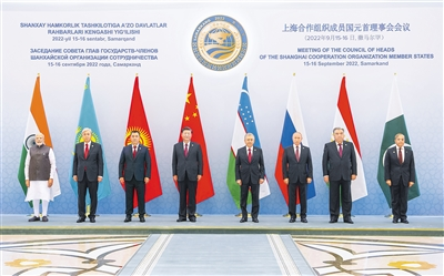 當(dāng)?shù)貢r間九月十六日,國家主席習(xí)近平在撒馬爾罕國際會議中心出席上海合作組織成員國元首理事會第二十二次會議小范圍會談。這是小范圍會談前,上海合作組織成員國領(lǐng)導(dǎo)人集體合影。新華社記者李濤攝