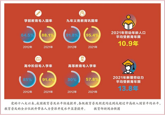 黨的十八大以來(lái),我國(guó)教育普及水平快速提升。截至2021年,全國(guó)共有各級(jí)各類學(xué)校52.93萬(wàn)所,在校生2.91億人,專任教師1844.37萬(wàn)人。各級(jí)教育普及程度均達(dá)到或超過(guò)中高收入國(guó)家平均水平,其中,學(xué)前教育、義務(wù)教育普及程度達(dá)到世界高收入國(guó)家平均水平,高等教育進(jìn)入國(guó)際公認(rèn)的普及化階段,教育總體發(fā)展水平躍居世界中上行列。推進(jìn)學(xué)前教育普及普惠,學(xué)前教育毛入園率達(dá)到88.1%,比2012年提高23.6個(gè)百分點(diǎn)。加快義務(wù)教育均衡發(fā)展和城鄉(xiāng)一體化,九年義務(wù)教育鞏固率達(dá)到95.4%,比2012年提高3.6個(gè)百分點(diǎn)。推進(jìn)高中階段教育普及攻堅(jiān),高中階段毛入學(xué)率達(dá)到91.4%,比2012年提高6.4個(gè)百分點(diǎn)。推動(dòng)高等教育內(nèi)涵式發(fā)展,高等教育毛入學(xué)率達(dá)到57.8%,比2012年提高27.8個(gè)百分點(diǎn)。教育普及的全方位躍升帶來(lái)人力資源開(kāi)發(fā)水平顯著提升,我國(guó)勞動(dòng)年齡人口平均受教育年限達(dá)到10.9年,新增勞動(dòng)力平均受教育年限達(dá)到13.8年,擁有大學(xué)文化程度的人口超過(guò)2.18億,勞動(dòng)力素質(zhì)結(jié)構(gòu)發(fā)生重大變化,全民族素質(zhì)極大提高。站在新的歷史起點(diǎn)上,我們要著力促進(jìn)各級(jí)各類教育協(xié)調(diào)發(fā)展,在固根基、揚(yáng)優(yōu)勢(shì)、補(bǔ)短板、強(qiáng)弱項(xiàng)上下功夫,持續(xù)擴(kuò)大優(yōu)質(zhì)教育資源供給,不斷提升全民受教育程度。