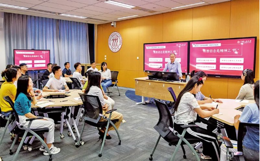 教育系統(tǒng)扎實(shí)推進(jìn)習(xí)近平新時(shí)代中國(guó)特色社會(huì)主義思想進(jìn)教材進(jìn)課堂進(jìn)頭腦,學(xué)校思想政治理論課改革創(chuàng)新成效顯著,“大思政課”建設(shè)全面推進(jìn)。圖為2022年6月11日,中國(guó)人民大學(xué)“習(xí)近平新時(shí)代中國(guó)特色社會(huì)主義思想概論”課堂。中國(guó)人民大學(xué)供圖