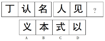 【答案】C【解析】觀察圖形特征,圖形不相似,組成元素不同,優(yōu)先考慮數(shù)量規(guī)律。發(fā)現(xiàn)題干和選項不存在面的數(shù)量規(guī)律,可以嘗試漢字筆畫數(shù)。先來看第一組,三個漢字依次筆畫數(shù)為2、4、6,筆畫數(shù)為等差數(shù)列規(guī)律,所以以第一組規(guī)律來找第二組,查看第二組已給兩漢字筆畫數(shù)依次為2、4,所以問號處應(yīng)填入漢字筆畫數(shù)為6,四個選項依次漢字筆畫數(shù)為3、5、6、4,因此,最后答案選擇到C。