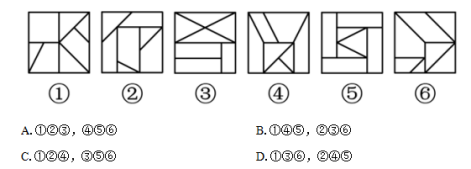 例3:把下面的六個圖形分為兩類,使每一類圖形都有各自的共同特征或規(guī)律,分類正確的一項是:( )