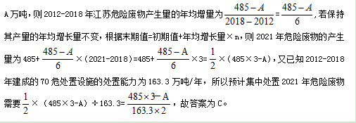 若江蘇危險廢物產(chǎn)生量保持2012-2018年年均增量不變,那么以2012-2018年建成的70座危險廢物集中處置設(shè)施的處置能力,預計集中處置2021年危險廢物需多少年?(假設(shè)2012年江蘇危險廢物產(chǎn)生量為A萬噸)( )