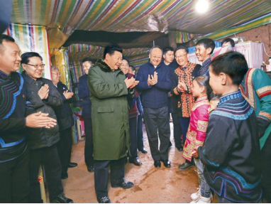 2018年2月10日至13日,中華民族傳統(tǒng)節(jié)日農(nóng)歷春節(jié)來(lái)臨之際,中共中央總書記、國(guó)家主席、中央軍委主席習(xí)近平來(lái)到四川考察調(diào)研,看望慰問各族干部群眾,向全國(guó)各族人民致以美好的新春祝福。這是2月11日上午,習(xí)近平在涼山彝族自治州昭覺縣三岔河鄉(xiāng)三河村貧困戶吉好也求家中看望,聽10歲小女孩吉好有果唱《國(guó)旗國(guó)旗真美麗》。新華社記者鞠鵬/攝