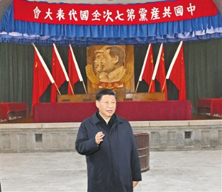 習(xí)近平等首先來(lái)到中共七大會(huì)址。1945年4月至6月黨的七大在這里召開(kāi)。我們黨成立時(shí)只有50多名黨員,到黨的七大召開(kāi)時(shí)已經(jīng)擁有了121萬(wàn)名黨員。習(xí)近平緩步瞻仰會(huì)場(chǎng),他表示,黨的七大在黨的歷史上具有重要里程碑意義,標(biāo)志著我們黨在政治上思想上組織上走向了成熟。在政治上,黨通過(guò)延安整風(fēng),使全黨團(tuán)結(jié)在毛澤東的旗幟下,實(shí)現(xiàn)了黨的空前統(tǒng)一和團(tuán)結(jié)。在思想上,黨確立了毛澤東思想在全黨的指導(dǎo)地位,把毛澤東思想寫(xiě)入了黨章。在組織上,黨形成了一支高舉毛澤東旗幟的久經(jīng)考驗(yàn)的政治家集團(tuán)。黨的七大在黨的歷史上具有極其重要的地位,為黨后來(lái)不斷從勝利走向勝利指明了正確方向、開(kāi)辟了正確道路。