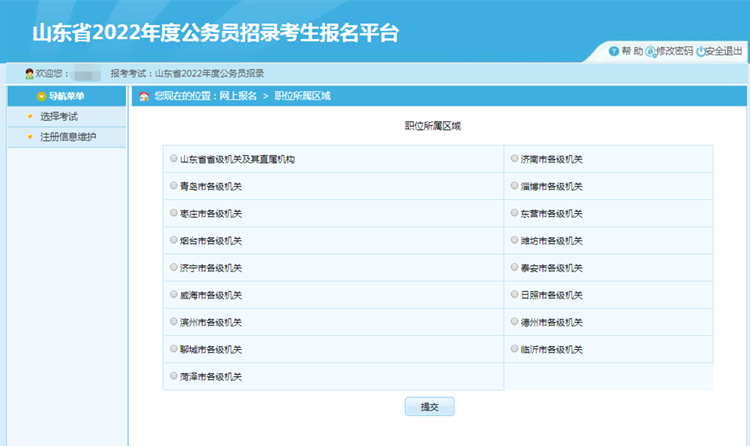選中【山東省2022年度公務(wù)員招錄】,點擊后進入選擇職位所屬地市: