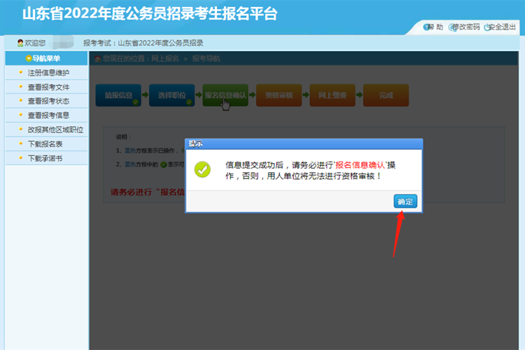 報考信息確認無誤后,點擊【報名信息確認】按鈕,完成報名信息確認,等待審核。