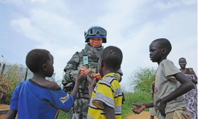2015年11月,中國維和部隊(duì)隊(duì)員在南蘇丹的難民營中給當(dāng)?shù)貎和l(fā)放糖果。