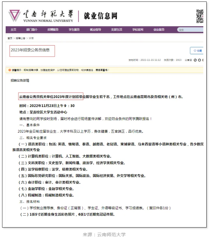 近日,云南師范大學(xué)發(fā)布2023省考宣講會消息:云南省公務(wù)員機(jī)關(guān)單位2023年度計劃招錄應(yīng)屆畢業(yè)生若干名,工作地點在云南省昆明市及各相關(guān)地(州)市。具體如下: