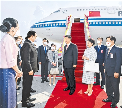 習近平和夫人彭麗媛乘坐的專機抵達曼谷素萬那普國際機場時,泰國總理巴育夫婦、副總理兼外長敦夫婦、文化部部長伊提蓬夫婦等熱情迎接。禮兵分列紅地毯兩側,身著靚麗民族服裝的當?shù)厍嗄晷泻鲜Y夾道歡迎,泰國華僑華人代表揮舞中泰兩國國旗,向習近平夫婦表示最熱烈的歡迎。