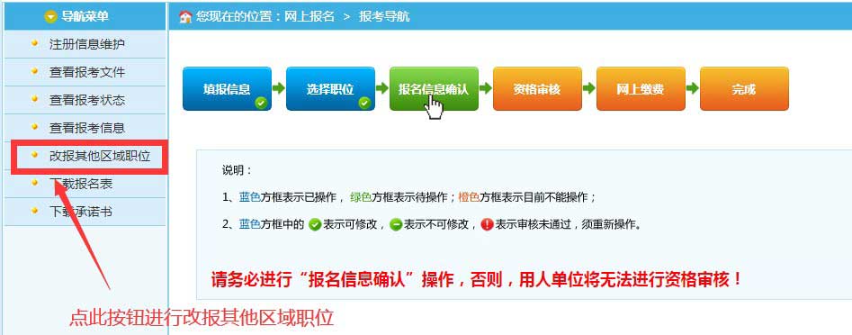 報名信息確認前,如需改報其他區(qū)域職位,點擊導(dǎo)航菜單頁面中的“改報其他區(qū)域職位”按鈕,進行改報其他區(qū)域職位。