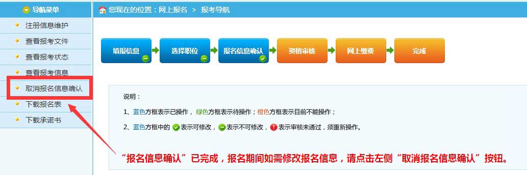 2.已進行“報名信息確認”操作的,須先取消報名信息確認狀態(tài),再進行信息修改。具體操作是:點擊導(dǎo)航菜單頁面中的“取消報名信息確認”按鈕。