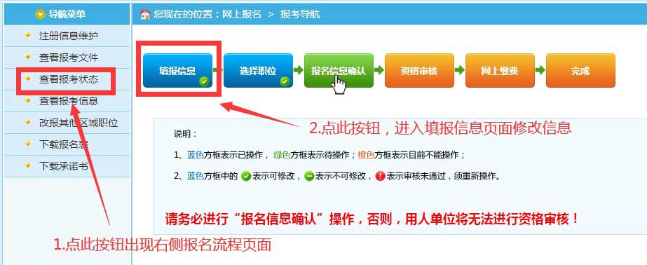 1.未進行“報名信息確認”操作的,先點擊導(dǎo)航菜單頁面中的“查看報考狀態(tài)”按鈕,再點擊報考導(dǎo)航頁面中的“填報信息”按鈕進行修改。