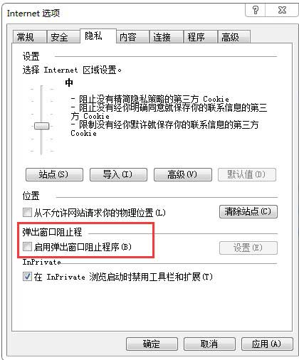 IE瀏覽器菜單欄—>工具選項下“Internet選項”—>隱私選項卡中將倒數(shù)第二個復(fù)選框“啟用彈出窗口阻止程序”取消勾選,最后點擊“確定”。效果如下圖: