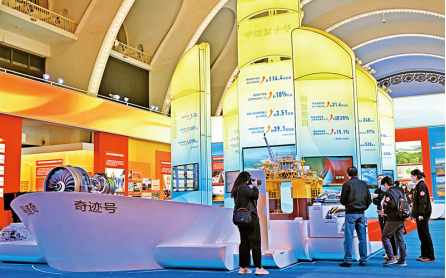 黨的十八大以來,以習(xí)近平同志為核心的黨中央提出并貫徹新發(fā)展理念,著力推進(jìn)高質(zhì)量發(fā)展,推動(dòng)構(gòu)建新發(fā)展格局,實(shí)施供給側(cè)結(jié)構(gòu)性改革,制定一系列具有全局性意義的區(qū)域重大戰(zhàn)略,我國經(jīng)濟(jì)實(shí)力實(shí)現(xiàn)歷史性躍升。圖為2022年10月8日,觀眾在“奮進(jìn)新時(shí)代”主題成就展中央綜合展區(qū)內(nèi)參觀拍攝中國經(jīng)濟(jì)“奇跡號(hào)”巨輪模型。新華社記者李鑫/攝