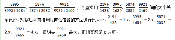 第三步選取合適的方法計算比較。想要計算得既快又準(zhǔn),一方面要在計算比較前注意觀察選項差距,根據(jù)選項的差距來選擇合適的計算比較方法,另一方面要對常用的計算比較方法爛熟于心,更重要的是要在平時勤加練習(xí),不斷提高自己的基本計算比較能力。