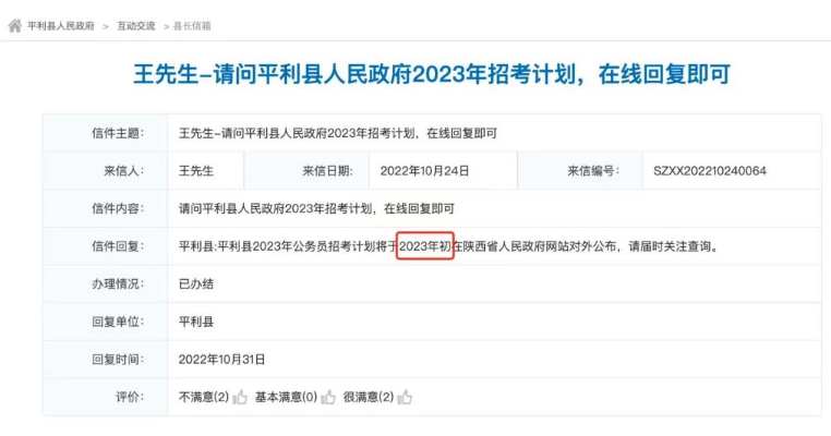 2023年公務(wù)員考試新消息,平利縣人民政府回復(fù)網(wǎng)友問(wèn)答,指出“平利縣2023年公務(wù)員招錄計(jì)劃將在年初公布”。
