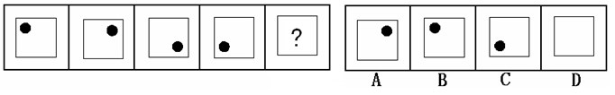 (答案:B。黑點在正方形中順時針移動。在第5個圖形中,應(yīng)該正好移動到左上角。)