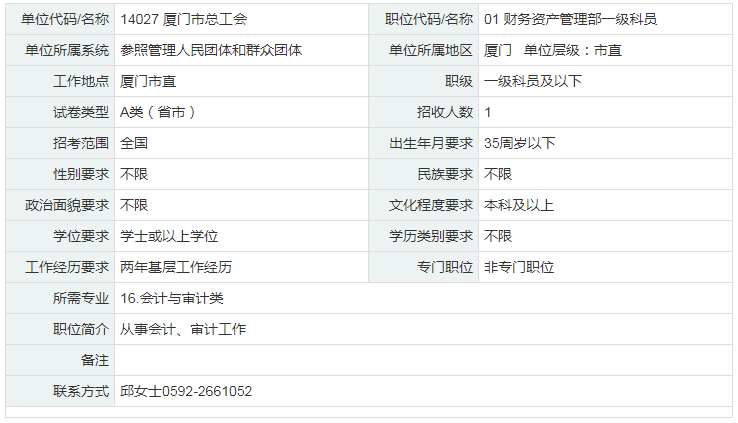 2023年福建廈門(mén)市總工會(huì)公務(wù)員考試職位信息表