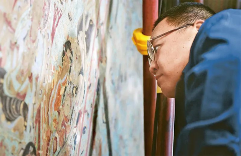 加大文物和文化遺產(chǎn)保護(hù)力度,提高傳承實(shí)踐能力。圖為2022年4月19日,在莫高窟第231窟,敦煌研究院文物保護(hù)技術(shù)服務(wù)中心的壁畫修復(fù)工作者在修復(fù)出現(xiàn)病害的壁畫。新華社記者杜哲宇/攝