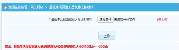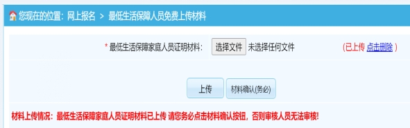 ?。ㄈ┻M(jìn)入最低生活保障人員免費上傳材料頁面,按要求上傳最低生活保障家庭人員證明材料(區(qū)內(nèi)報考人員登錄廣西社會救助信息管理系統(tǒng)查詢到包含您個人信息的截圖)。