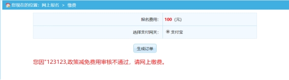 2.審核不通過,須點擊“生成訂單”進(jìn)行網(wǎng)上繳費。