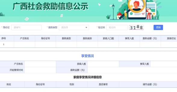 (一)登錄廣西社會救助信息管理系統(tǒng)(http://mzxt.mzt.gxzf.gov.cn:8109/gx_shjz/#/lowInsuranceMsg/MsgSearch),進(jìn)入廣西社會救助信息公示頁面。