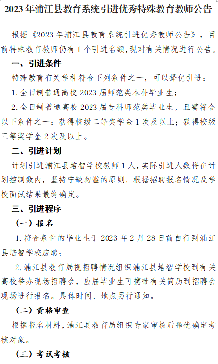 2023年浙江金華浦江縣教育系統(tǒng)引進(jìn)優(yōu)秀特殊教育教師公告
