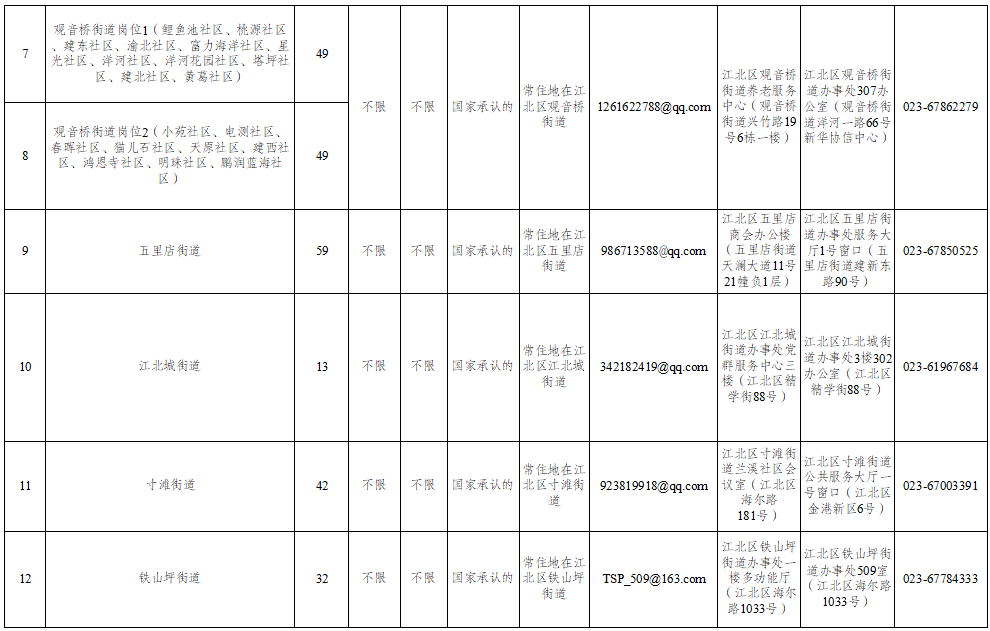 8. 根據(jù)專職網(wǎng)格員工作性質(zhì),報考人員常住地原則上在報考崗位所在鎮(zhèn)街范圍內(nèi),具體要求見《重慶市江北區(qū)2023年專職網(wǎng)格員招聘職位表》。