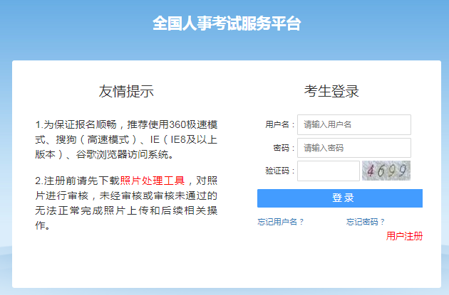 3.上傳照片。注冊(cè)完成后,上傳經(jīng)“人事考試照片審核處理工具”軟件審核通過并自動(dòng)生成的照片?!叭耸驴荚囌掌瑢徍颂幚砉ぞ摺避浖趫?bào)名系統(tǒng)登錄界面下載,解壓后請(qǐng)務(wù)必先認(rèn)真閱讀readme.doc文件。上傳的照片須為近期拍攝的正面、免冠證件照片。