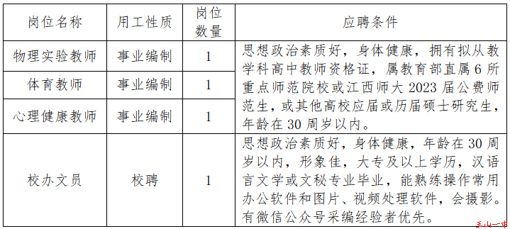 筆試面試:教師崗位,根據(jù)崗位性質(zhì),筆試采用做高考模擬試題方式,面試采用說課或現(xiàn)場(chǎng)演示方式;筆試面試于2月下旬擇日進(jìn)行。文員崗位,筆試采用現(xiàn)場(chǎng)文稿寫作方式,面試采用現(xiàn)場(chǎng)實(shí)踐操作方式。合格者,履行錄用簽約手續(xù)。