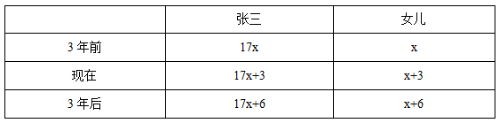 例3:3年前張三的年齡是他女兒的17倍,3年后張三的年齡是他女兒的5倍,那么張三的女兒現(xiàn)在多少歲?( )