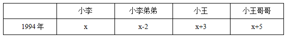 根據(jù)“在1994年,小李的弟弟和小王的年齡之和為15”,有x-2+x+3=15,解得x=7。進(jìn)而可知1994年和2014年四人的年齡情況: