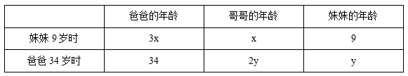 【答案】C【解析】當(dāng)妹妹9歲時(shí),設(shè)哥哥的年齡為x歲,則爸爸的年齡為3x歲;當(dāng)爸爸34歲時(shí),設(shè)妹妹的年齡為y歲,則哥哥的年齡為2y歲。列表如下:
