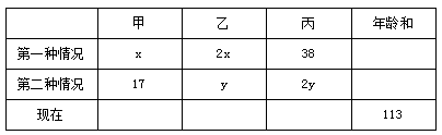 根據(jù)年齡差不變,列方程得2x-x=y-17,38-2x=2y-y;解得x=7,y=24。則可知甲、乙的年齡差為7歲,乙、丙的年齡差為24歲,設(shè)乙現(xiàn)在的歲數(shù)為z,則甲、丙現(xiàn)在的年齡分別為(z-7)歲、(z+24)歲,則(z-7)+z+(z+24)=113,解得z=32,故本題選擇B。