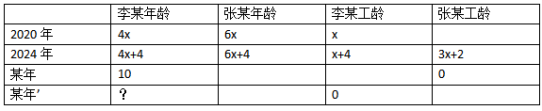 例2:2020年時(shí),李某的年齡是張某的2/3,且正好是自己工齡的4倍。2024年時(shí),張某的年齡正好是自己工齡的2倍,已知張某參加工作時(shí)李某10歲,問李某是幾歲參加工作的?( )