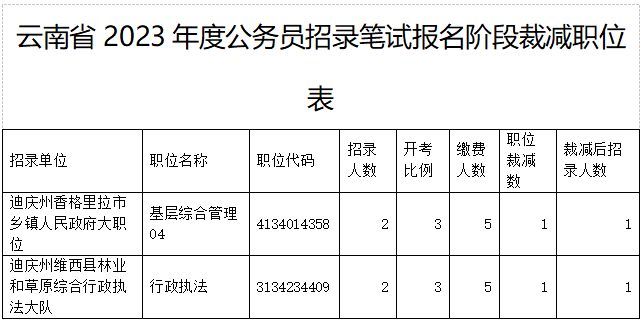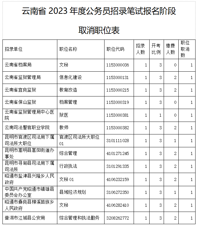 關(guān)于云南省2023年度公務(wù)員招錄筆試報(bào)名階段取消及裁減部分職位的通告