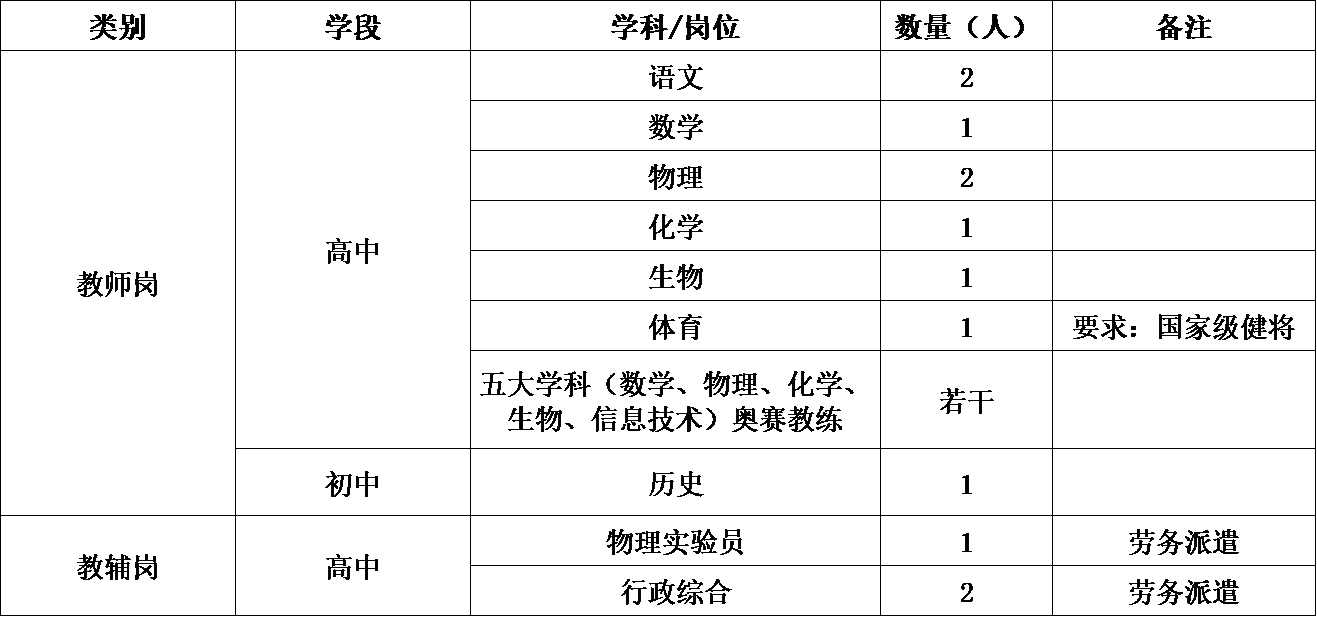 5.除特殊說明外,應(yīng)屆畢業(yè)生需具備碩士及以上學(xué)歷(清華北大本科即可;應(yīng)聘初中教師者,優(yōu)秀的公費(fèi)師范生亦可考慮),在校學(xué)習(xí)成績優(yōu)秀,有學(xué)生干部經(jīng)歷者優(yōu)先;在職教師需具備碩士及以上學(xué)歷,要求在中學(xué)有三年及以上的任教經(jīng)歷,具備中級及以上職稱。