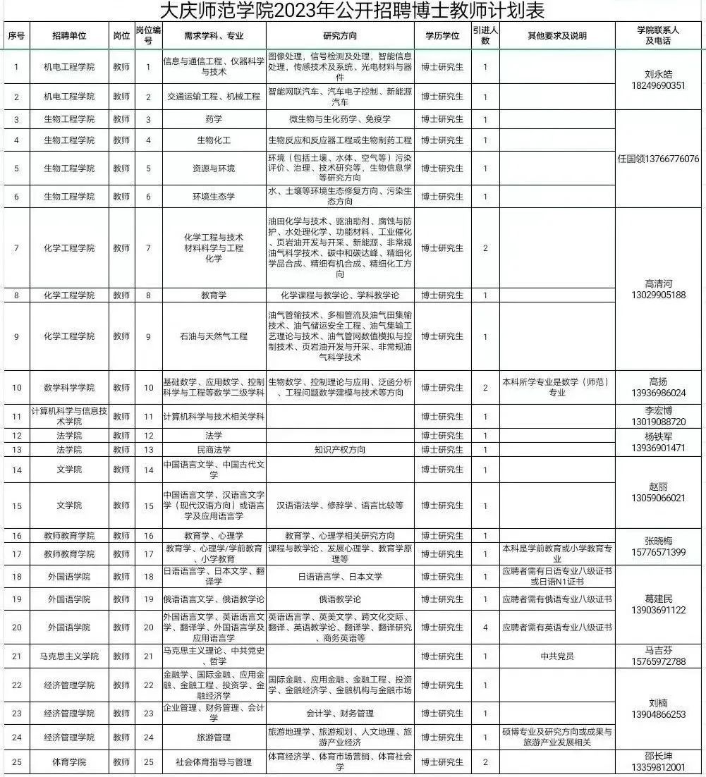 詳見《大慶師范學院2023年公開招聘博士教師計劃表》(附件1)。