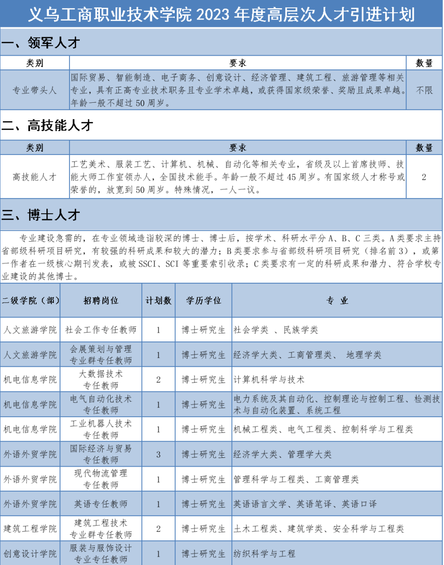 義烏工商職業(yè)技術(shù)學(xué)院是浙江省高職高水平學(xué)校、浙江省優(yōu)質(zhì)高職院校,榮登全國創(chuàng)新創(chuàng)業(yè)典型經(jīng)驗高校,獲評國家級創(chuàng)新創(chuàng)業(yè)教育實踐基地?,F(xiàn)因?qū)W校發(fā)展需要,面向社會招聘一批高層次人才和專任教師。