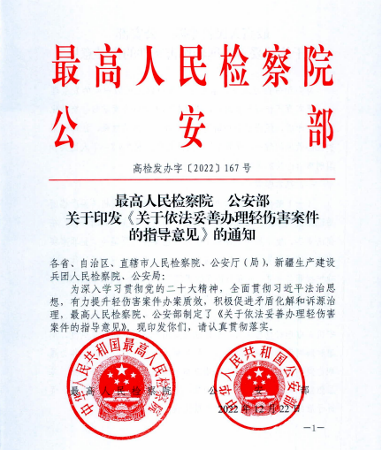 最高檢公安部發(fā)布:關(guān)于依法妥善辦理輕傷害案件的指導(dǎo)意見(jiàn)