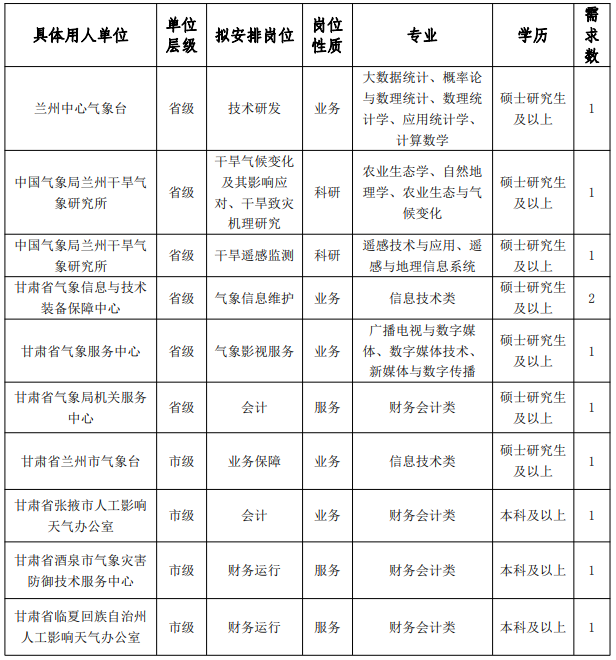 根據(jù)《氣象部門事業(yè)單位公開招聘應屆高校畢業(yè)生管理辦法》和《甘肅省氣象部門事業(yè)單位公開招聘應屆高校畢業(yè)生實施細則》的要求,為滿足甘肅省氣象局事業(yè)單位工作需要,本階段面向應屆高校畢業(yè)生公開招聘工作人員11名?,F(xiàn)就有關事項公告如下: